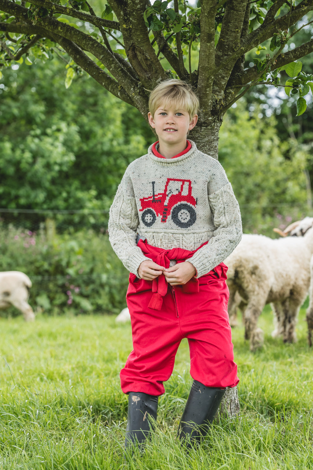 Introduce your little ones to classic country charm with The Mini Muchelney Tractor Knitted Jumper. Made from luxurious British wool and crafted in Britain, this jumper features a traditional Aran pattern with a red tractor motif. Designed with a cosy tunic-style neck it’s perfect for keeping toddlers, children, and preteens warm and stylish during day-to-day wear and outdoor adventures.